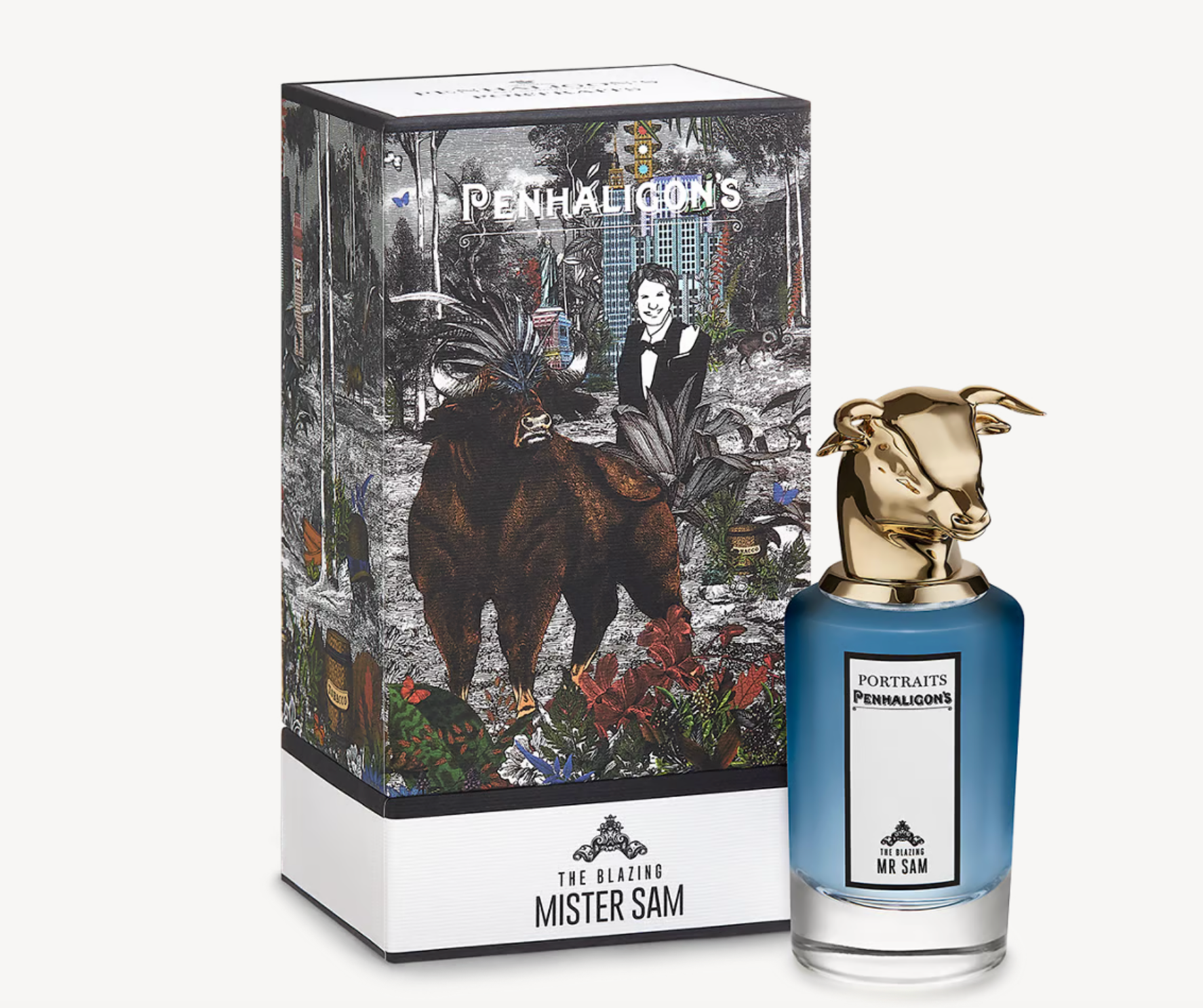 The Blazing Mister Sam by Penhaligon's is a bold, spicy-woody fragrance with notes of cardamom, black pepper, cedarwood, patchouli, and tobacco, exuding confidence and charm.